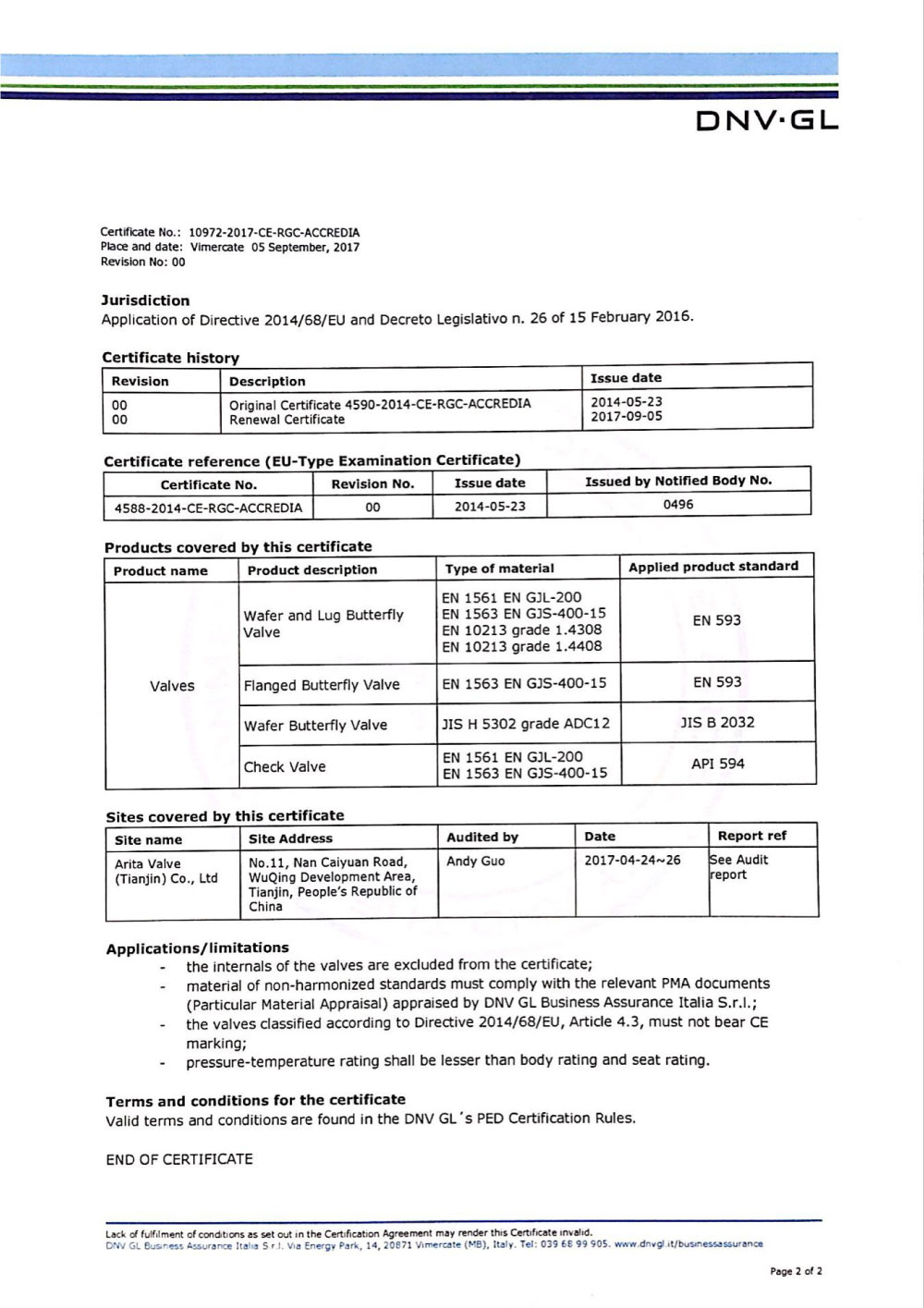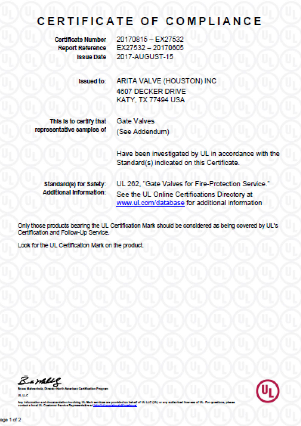 Arita UL Certificates for Gate Valves